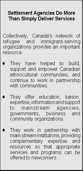 In addition, Canada has developed over the years a broad network of organizations whose mission, in whole or in part, is to serve refugees and immigrants in their process of adjustment to Canadian society. These organizations have accumulated considerable depth and breadth of experience in newcomer settlement services. Many refugees and immigrants receive assistance from such organizations, some just briefly, others over a long period. Refugee and immigrant-serving organizations also play a key role in helping the host society to adapt to newcomers, by sensitizing institutions and the public to their realities.