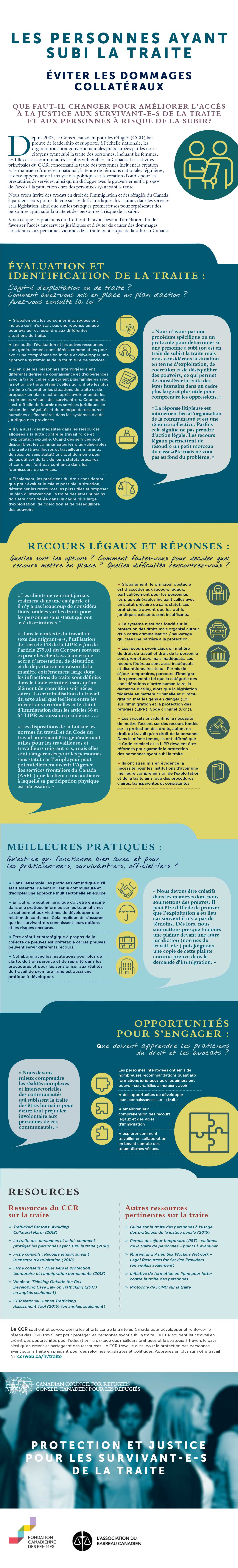 Le CCR a invité des avocats spécialisés en droit de l'immigration et des réfugiés du Canada à partager leurs points de vue sur les défis juridiques, les lacunes dans les services et la législation, et sur les pratiques prometteuses pour représenter des personnes ayant subi la traite et des personnes à risque de la subir.