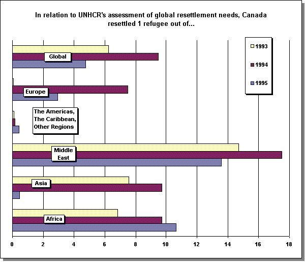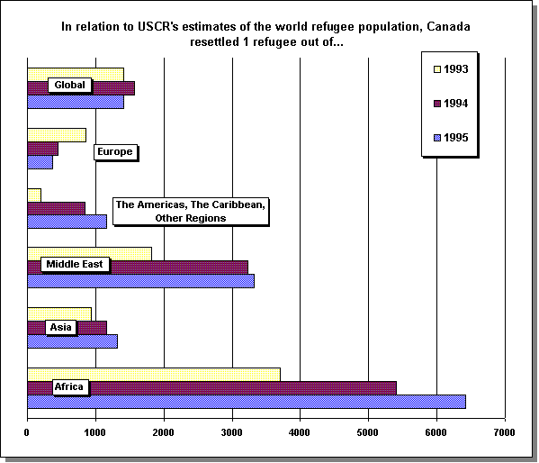 Canada's resettlement program in proportion to the world refugee population as estimated by USCR. (E. g.: In 1993, Canada resettled 1 out of 3713 refugees in Africa). The larger the number, the more people there are potentially competing for each resettlement space.